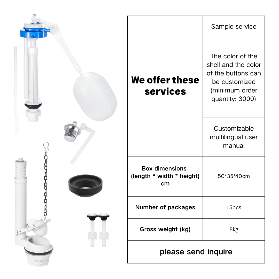 This toilet cistern repair kit is designed as a complete solution for replacing internal components of a two-piece toilet tank. The set includes a G1/2 fill valve, a 2-inch single flush valve, and a side push button, making it suitable for most standard toilet cistern systems in the replacement market. As a professional toilet tank parts manufacturer, we developed this combination based on hot-selling configurations in South America, helping distributors and e-commerce sellers quickly match market demand.