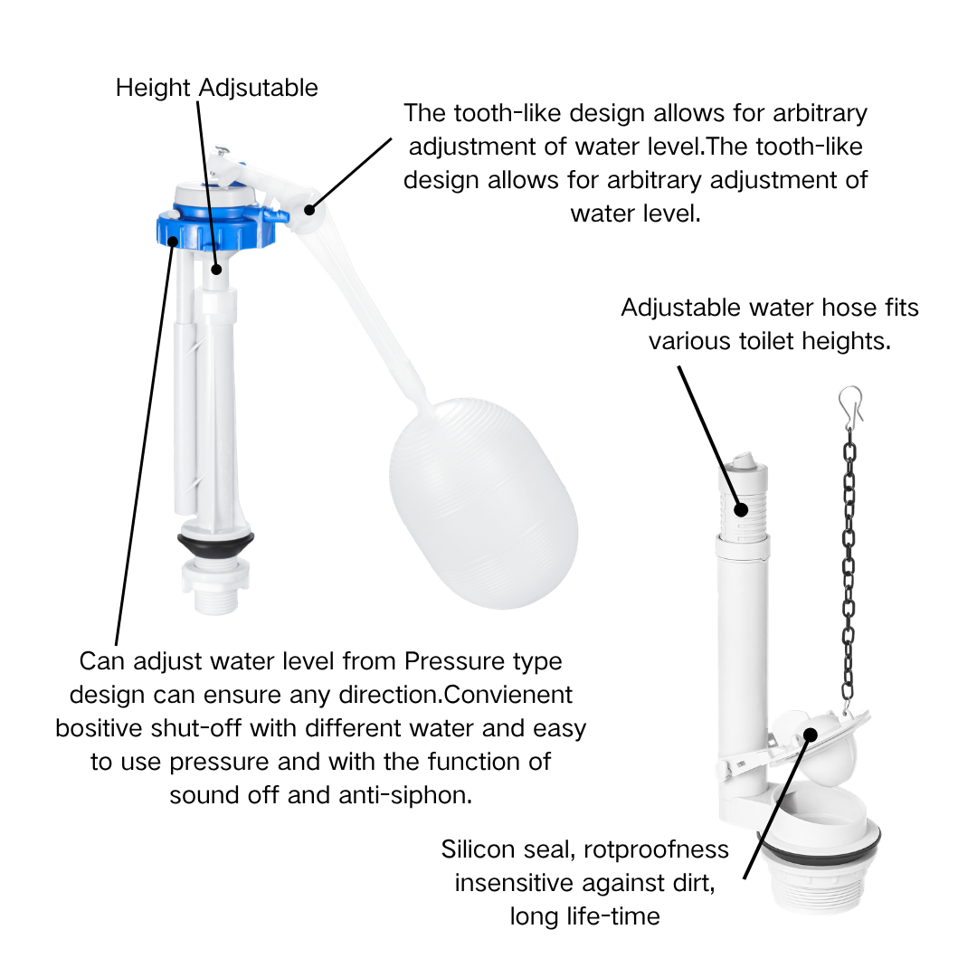 First, When the water seal in the toilet bowl is insufficient, the refill tube of the inlet valve directs water through the overflow pipe to replenish the bowl. This helps form a water seal in the U-shaped trap, preventing sewer odors from escaping and contaminating the bathroom.