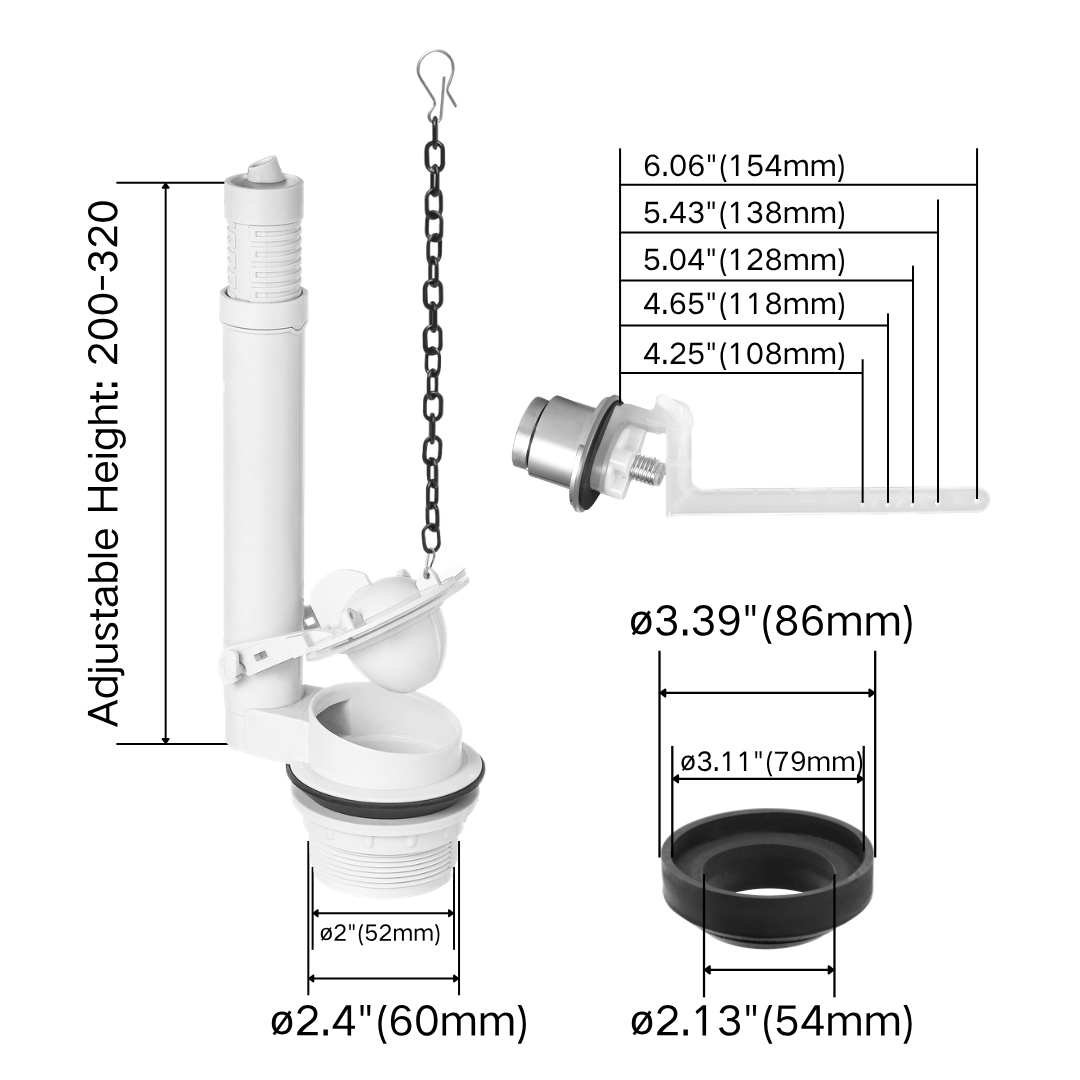 The 2-inch flush valve is built with an adjustable overflow pipe, allowing flexible height adjustment from 200mm to 320mm. Combined with a strong sealing system and durable gasket, it provides long-lasting leak-proof performance. This configuration is widely used in toilet cistern flush valve factory production lines, ensuring stability and durability for large-volume orders.