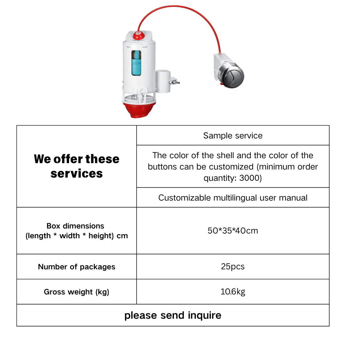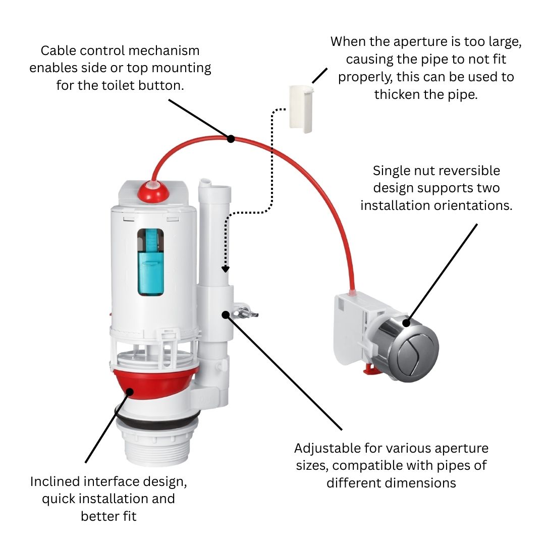 This cable control flush valve is designed as a smart dual flush conversion kit, allowing users to upgrade traditional single flush systems into efficient dual flush operation. With its flexible cable mechanism, it supports both top and side button installation, offering strong adaptability for different toilet structures.