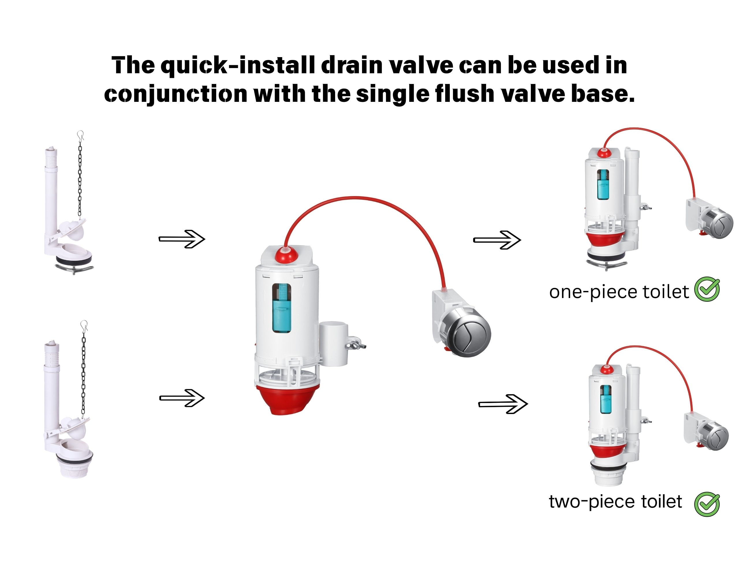 As a universal toilet flush valve, it fits most standard tanks and works perfectly as a 2 inch flush valve replacement. This complete toilet tank repair kit is suitable for both one-piece and two-piece toilets, while also functioning reliably as a side button flush valve solution for various installation needs.