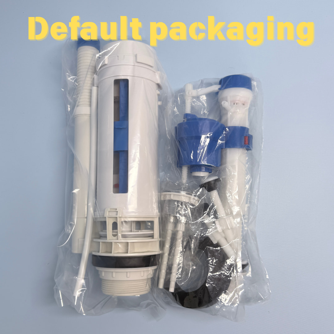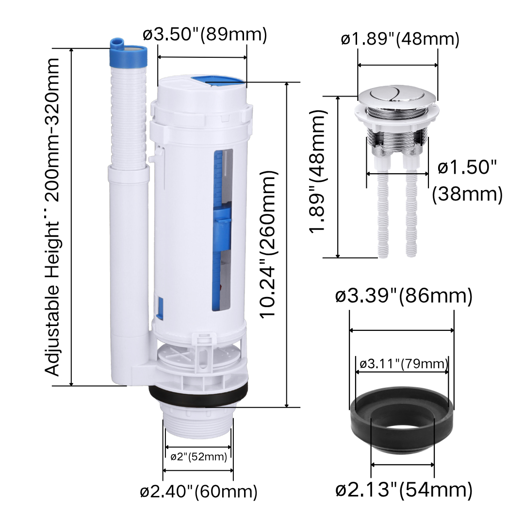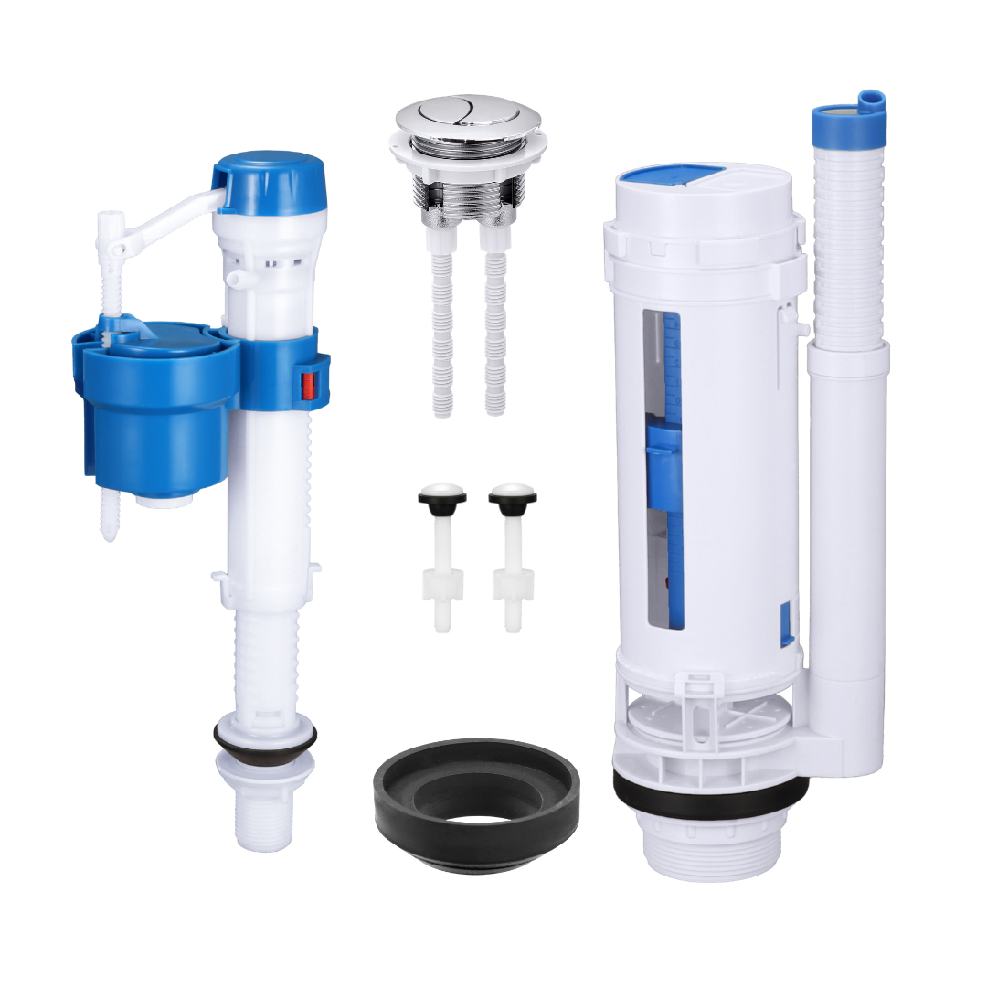 This universal toilet tank repair kit is designed for two-piece toilets and widely used in the replacement market. The set includes a 2-inch dual flush valve, adjustable fill valve, top push button, gasket, and fixing bolts, providing a complete solution for toilet cistern maintenance.