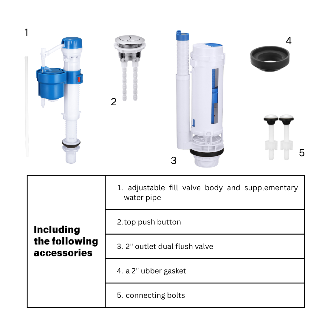 This toilet tank repair kit is a complete solution designed for replacing internal parts in standard two-piece toilet tanks. The set includes an adjustable toilet fill valve, a 2-inch dual flush valve, a chrome top push button, gasket, and connecting bolts, providing everything needed for efficient installation and long-term performance.