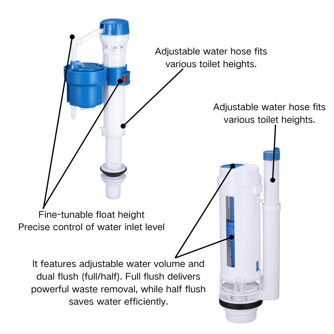 The adjustable fill valve features precise float control, allowing accurate water level adjustment to suit different tank heights. This makes it especially suitable as a toilet repair kit for plumbers and maintenance teams who need a reliable product for various installation conditions. The stable water inlet system helps prevent overflow and ensures consistent refilling performance.